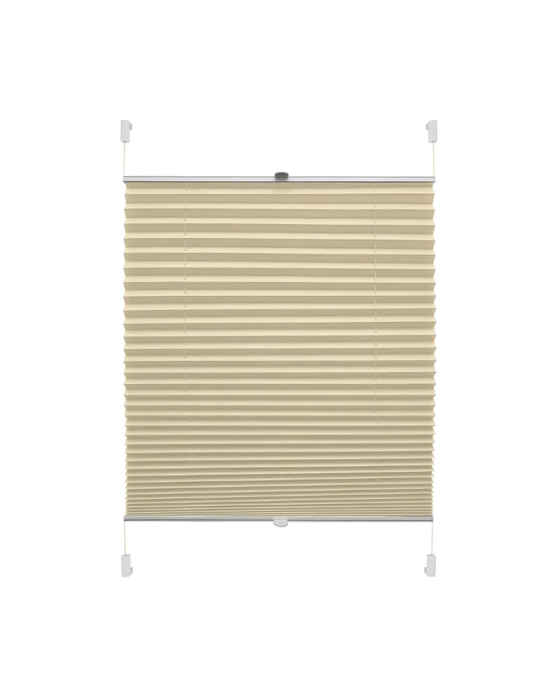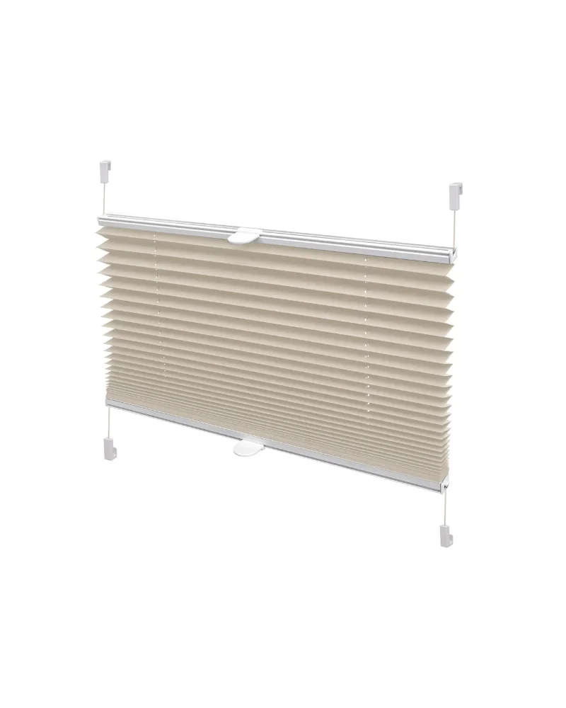 Bež termo Easyfix zavjesa kombinira dizajn i funkcionalnost. Tkanina od 100% poliestera s aluminijskim slojem s unutarnje strane štiti od topline i hladnoće. Uz 20 mm naborima, dvije aluminijske upravljačke letvice omogućuju individualnu prilagodbu visine. Uključuje 2 ručke i 4 nosača za montažu bez bušenja (6–30 mm). Dodatna oprema: nosač Art. 33420 ili ljepljivi Art. 33421.