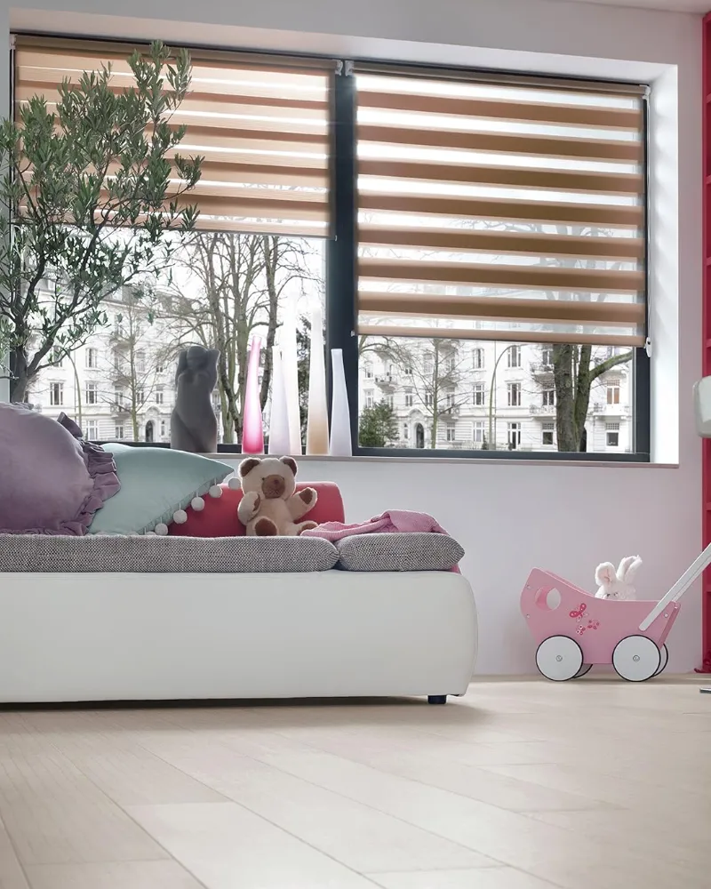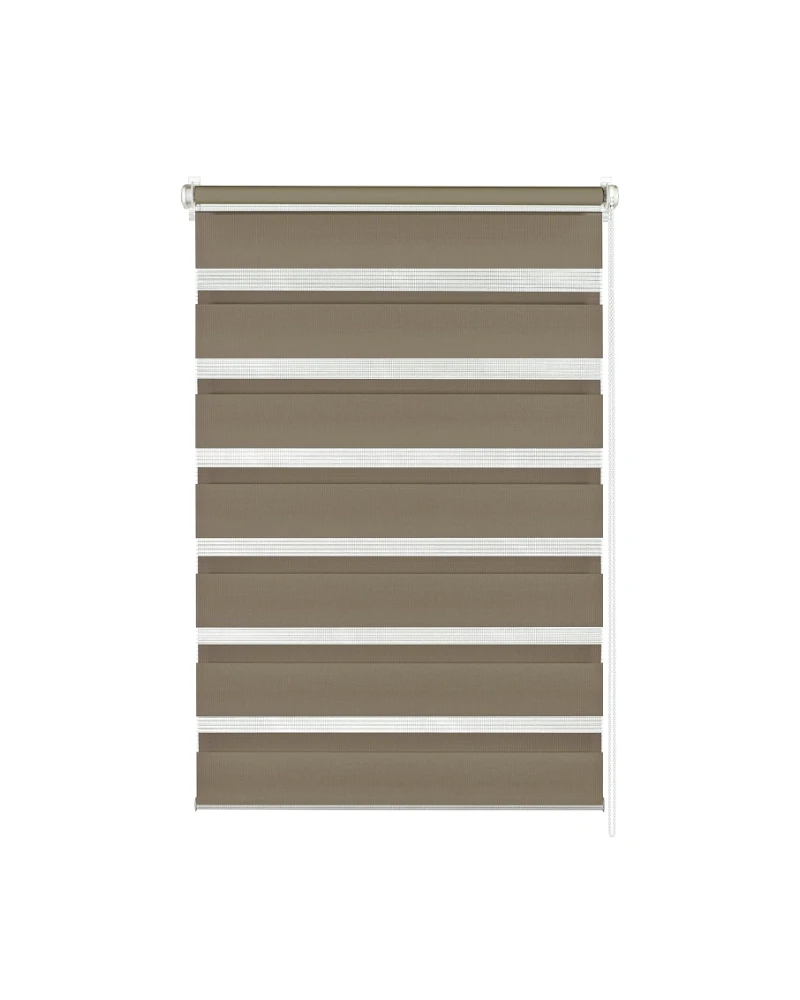 Smeđa dekorativna rolo zavjesa s dvostrukim slojem tkanine pruža dodatnu kontrolu svjetlosti uz naglasak na prirodne tonove. Easyfix sustav bez bušenja omogućuje jednostavno postavljanje zavjese na okvir prozora, a tkanina od 100% poliestera garantira dugotrajnost i lako održavanje. Zahvaljujući izmjeni transparentnih i zatamnjenih traka, zavjesa omogućuje dinamično reguliranje osvijetljenosti, idealno za dnevne boravke, kuhinje ili urede.