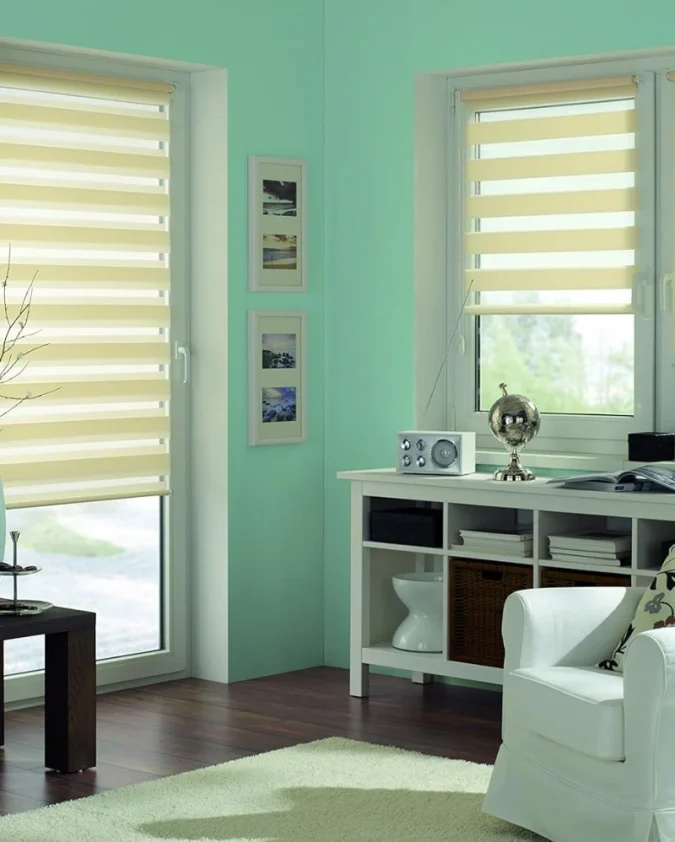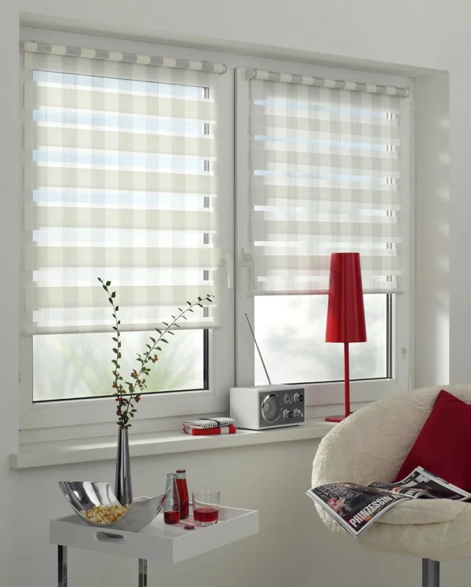 Dvostruka bijela Easyfix rolo zavjesa bez bušenja pruža diskretnu eleganciju i mogućnost regulacije svjetlosti u dvije razine.