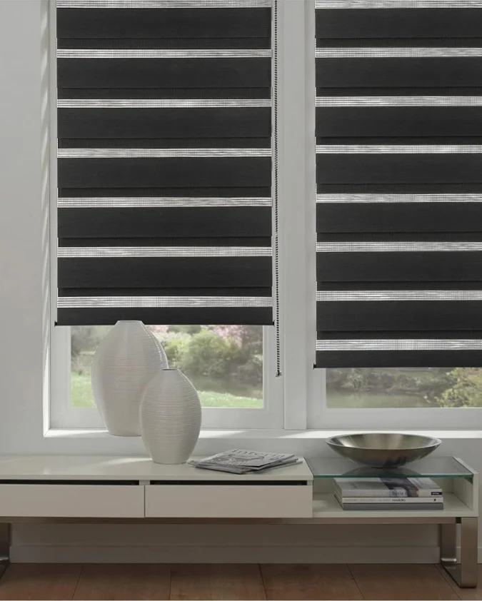 Crna karo Easyfix rolo zavjesa bez bušenja kombinira kontrastni uzorak i preciznu kontrolu svjetlosti – bez kompromisa.