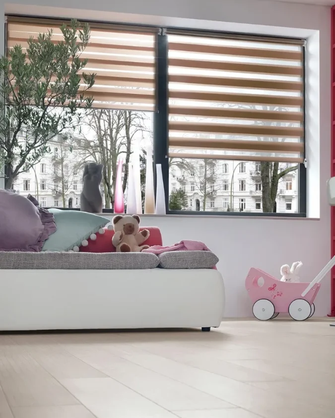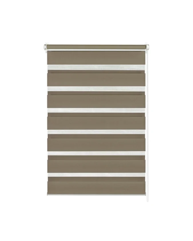 Smeđa dvostruka rolo zavjesa Easyfix nudi toplinu, privatnost i fleksibilno zasjenjenje – bez alata i bušenja.