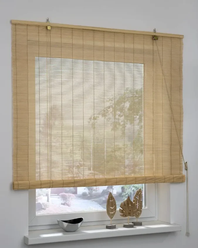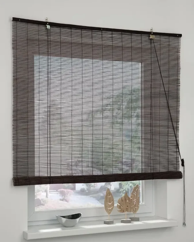 Dekorativna rolo zavjesa od bambusa u smeđoj boji unosi prirodnu eleganciju i funkcionalnost u svaki prostor, s praktičnom vrpcom za podešavanje visine.