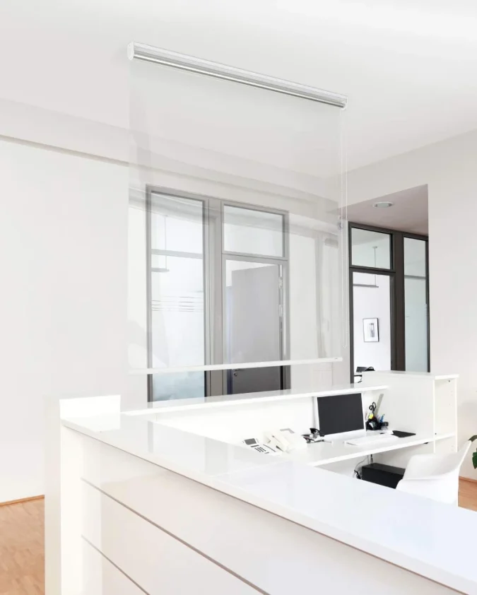 Prozirna rolo zavjesa za higijensku zaštitu izrađena od PET folije, otporna na ogrebotine i UV zračenje, idealna za prostore s visokim higijenskim zahtjevima.